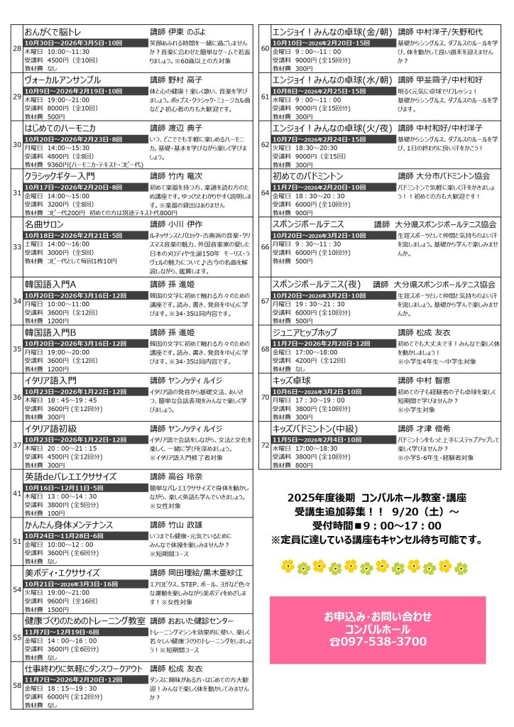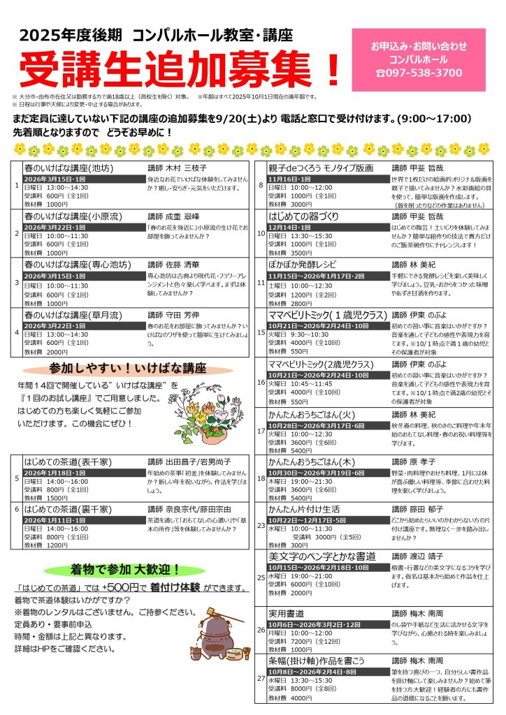 令和7年度コンパルホール教室・講座(後期) 受講生追加募集のお知らせ