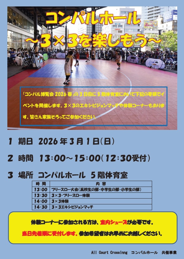 「コンパル博覧会2026春」の3日目の3月1日(日)13:時から5階体育室においてスポーツイベントを開催します。3×3のエキシビジョンマッチや体験コーナーもあります。皆さん家族そろってご参加ください。参加料は無料です。