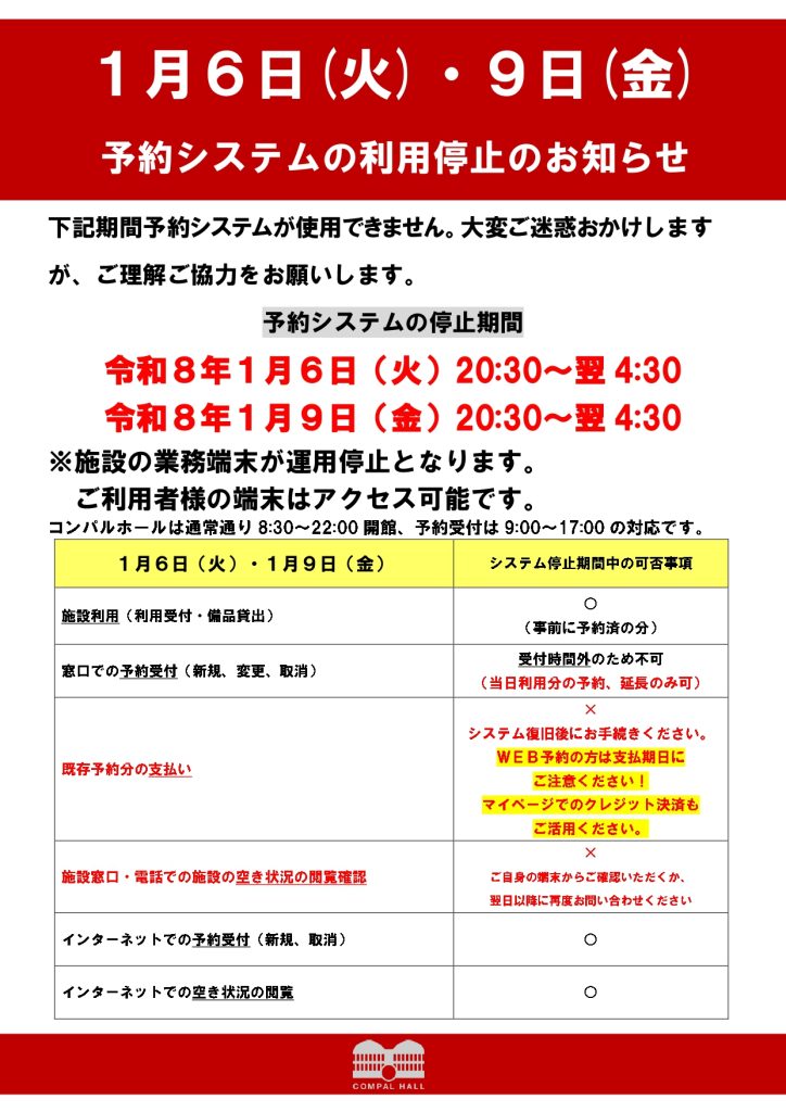 コンパルホールは通常通り8:30~22:00開館します。予約受付は9:00~17:00の対応です。