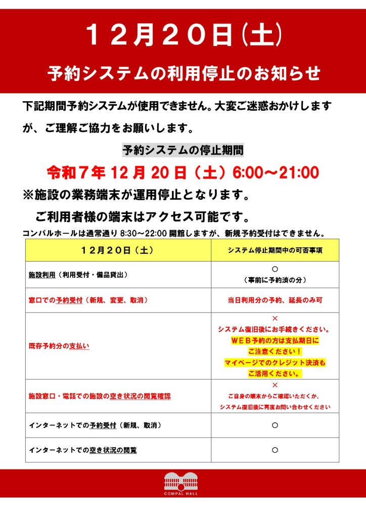 コンパルホールは通常通り8:30~22:00開館します。